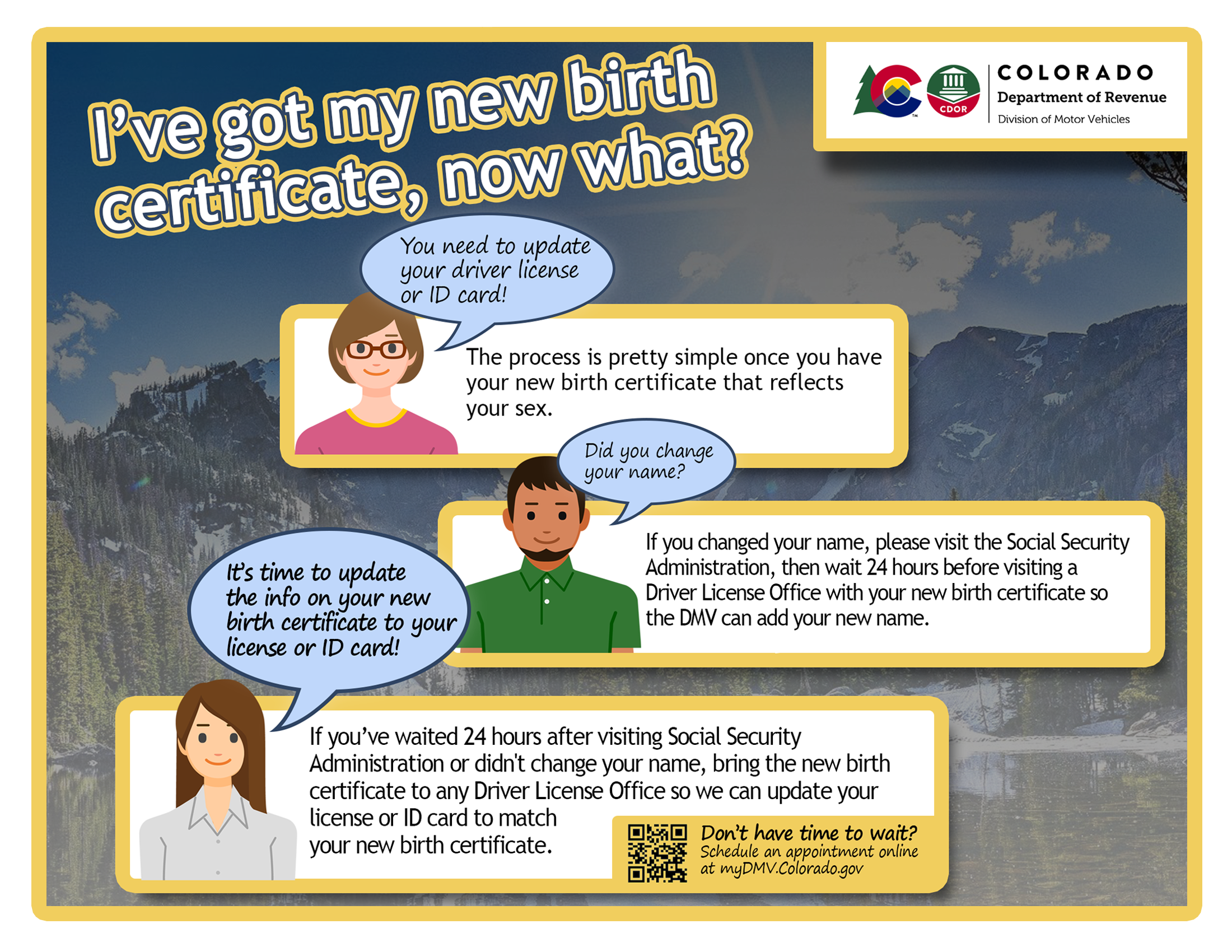 - To get a new birth certificate, please visit the Colorado Department of Public Health and Environment. Instructions on what to do once you have a new birth certificate.